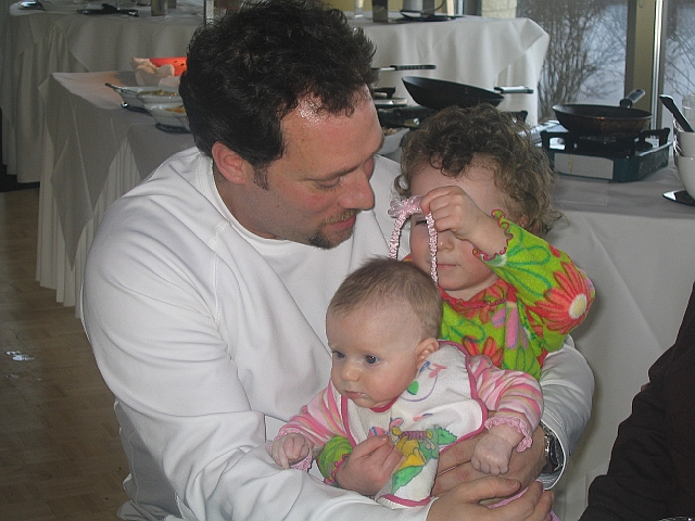 Émilie helping Livvy put on her head-band.